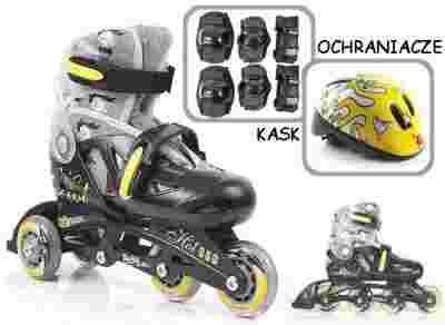Rodzaj: Wrotko-rolki Stan: Nowy Min. długość wkładki: 21.00 [cm] Maks.długość wkładki: 23.00 [cm] Kolor: Żółty, Srebrny, Czarny Dodatkowe informacje: Kask, Ochraniacze
