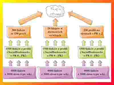 - Utworzymy po 1500 linków z profili na forach oraz stron typu Social Bookmarks prowadzących do każdego z elementów I warstwy piramidy.