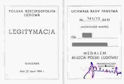 40 lat Polski Ludowej legitymacja