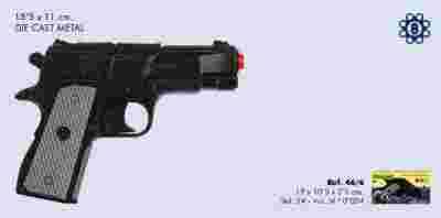 REWOLWER POLICYJNY NA 8 KAPISZONÓW ZABAWKA GONHER MODEL 46/6 (W KOLORZE CZARNYM) 50 lat tradycji, wysoka jakość, producent GONHER, kraj pochodzenia Hiszpania. Zabawka akustyczna, imitująca prawdziwą broń. Pistolet na kapiszony policyjny (czarny). Korpus, magazynek, lufa i rdzeń kolby wykonane z metalu. Okładzina kolby z tworzywa. Po naciśnięciu bocznego przycisku z korpusu wysuwa się ku górze magazynek na 8 szt kapiszonów osadzonych w pierścieniu 125 decybeli (klaśnięcie w dłonie). Kapiszony w pierścieniach do nabycia oddzielnie. Kapiszony znajdują się na innej mojej aukcji. Zabawka dla dzieci od lat 3. Certyfikat bezpieczeństwa CE. Kraj pochodzenia Hiszpania.