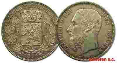 47.BELGIA, LEOPOLD II, 5 FRANKÓW 1871