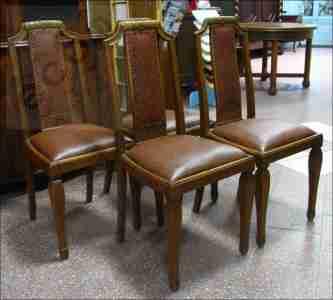 Komplet dębowych krzeseł secesyjnych z przełomu XIX/XXw. Krzesła ze skórzaną tapicerką, na pasach. Na innych aukcjach wystawiamy kredens i komodę oraz fotel, które mogą stanowić razem piękny, duży komplet.