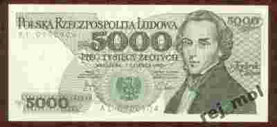Krótka historia:pierwsza emisja banknotów o nominale 5000 zł. z serii dwuliterowej późnego PRL z wizerunkiem genialnego polskiego kompozytora Fryderyka Chopina autorstwa A. Heidricha. Generalnie 1 czerwca 1982 r. NBP wprowadził do obiegu banknoty 5000 zł. z serią jednoliterową od A do Z oraz z serią dwuliterową z literkami: AA-AW; BU-BZ; CA-CN; DF-DP - łącznie 42 banknoty. Następna druga emisja tych banknotów miała miejsce w 1986 r., trzecia i ostatnia w 1988 r.