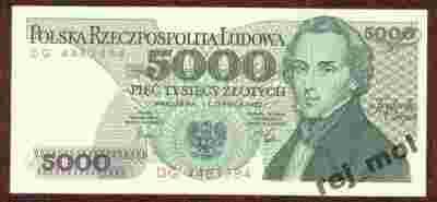 Krótka historia:pierwsza emisja banknotów o nominale 5000 zł. z serii dwuliterowej późnego PRL z wizerunkiem genialnego polskiego kompozytora Fryderyka Chopina autorstwa A. Heidricha. Generalnie 1 czerwca 1982 r. NBP wprowadził do obiegu banknoty 5000 zł. z serią jednoliterową od A do Z oraz z serią dwuliterową z literkami: AA-AW; BU-BZ; CA-CN; DF-DP - łącznie 42 banknoty. Następna druga emisja tych banknotów miała miejsce w 1986 r., trzecia i ostatnia w 1988 r.