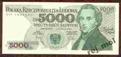 Krótka historia:pierwsza emisja banknotów o nominale 5000 zł. z serii dwuliterowej późnego PRL z wizerunkiem genialnego polskiego kompozytora Fryderyka Chopina autorstwa A. Heidricha. Generalnie 1 czerwca 1982 r. NBP wprowadził do obiegu banknoty 5000 zł. z serią jednoliterową od A do Z oraz z serią dwuliterową z literkami: AA-AW; BU-BZ; CA-CN; DF-DP - łącznie 42 banknoty. Następna druga emisja tych banknotów miała miejsce w 1986 r., trzecia i ostatnia w 1988 r.
