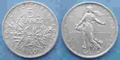 5 francs,Francia 1960,piekne srebro od 1 zl.