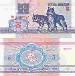 5 rubli Białoruś 1992stan UNC wilki seria AO