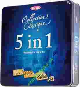 Jest to komplet dla wszystkich, pragnących mieć pod ręką znane i lubiane gry na całym świecie (Backgammon, Domino, Kółko i krzyżyk, Szachy, Warcaby)! Wszystkie elementy zestawu są solidnie wykonane z drewna, a całość spakowana do metalowego pudełka. Dzięki temu gry te będą służyć ci przez lata!