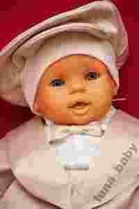Garniturek jest uszyta z satyny bawełnianej - 97%, 3% lycry w srebrne prążki - kolor beżowy i szaro-niebieski.Z tego samego materiału co garniturek, uszyte są, muszka i czapka-kaszkiet.