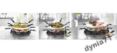 Przedmiotem aukcj jest zestwa do przygotowania raclette i fondue,ceramiczny.Mozliwość przygotowania:pysznych steków,grillowanego mięsa,oryginalnych przekąsek typu raclette oraz fondue.Mini patelnie oraz płyta grilla są wykonane z tworzywa odpornego na przywieranie.Możliwość regulowania temperatury poprzez wbudowany termostat.Możliwość używania całego zestawu razem lub poszczególnych części zestawu.Jedna z patelek posiada drobne zarysowania od strony zewnętrznej.Zasilanie 230V/50Hz