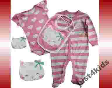 Komplet wykonany z najwyższej jakości milutkiej w dotyku bawełny(skład: 100% bawełny). W zestawie są : pajacyk zapinany na całej długości na napki, bodaczek w serduszka oraz śliniak.