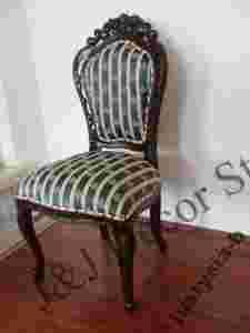 J&J Decor Studio zaprasza na aukcje! Przedmiotem aukcji jest przepiękne krzesło wykonane w całości z litego drewna mahoniowego w kolorze ciemnobrązowym (ciemny kasztan delikatnie przechodzący w mahoń). Elegancja, szyk, klasyka. Lite drewno, tapicerka wykonana z eleganckiego materiału obiciowego. Krzesła są bardzo solidnie i precyzyjnie wykonane. Tapicerka jest uzupełniona złotymi nitami, co sprawia, że wyglądają one bardzo elegancko. Produkt jest nowy.