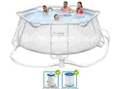 * średnica: 330 cm * wysokość: 102 cm * wypełnienie woda: 90% * wydajność pompy 1249l/h * waga: około 42 kg * szybkość montażu: ok. 20 min. (2 osoby) * kolor: szary