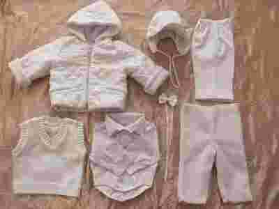 W skład kompletu wchodzi : - kurtka z kapturem w kolorze białym wykonana z pikowanej tkaniny ocieplona polarkiem, zapinana na zameczek, - spodnie garniturowe w kancik w kolorze białym wykończone mankietem, - kamizelka dzianinowa w kolorze białym, - biała bawełniana koszula z długim rękawem, - czapeczka z daszkiem wykonana z takiej samej tkaniny jak spodnie, ocieplana polarkiem, z tyłu wszyta gumka umożliwiająca regulację, z przodu ściągacz - mucha w kolorze białym Idealne ubranko na chrzest w chłodne dni. Dodatkowo białe buciki - gratis. Wymiary: 1. KURTKA: dł. z tyłu: 29 cm szer. ramion 21cm dł. rękawa od ramienia: 27 cm dł. rękawa od paszki: 17 cm Rękaw można wywinąć na dowolną długość 2. SPODNIE: dł. całk. od pasa: 33 cm dł od kroku:18 cm szer.w pasie (rozciągnięte): 60 cm. 3. KOSZULA: dł. całk.: 26,5 cm szer.pod paszk.: 2x25cm kołnierzyk 26-27 dł. rękawa: 29/13 cm 4. KAMIZELKA: dł. całk.:27,5 cm szer. pod pachami 2x25cm 5. CZAPECZKA: obw. 36-40 cm 6. PODPINKA DO SPODNI z polaru 7. MUCHA 8. BUCIKI dł. 11,5cm