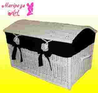 Kufer w kolorze białym wykonany z materiału ekologicznego - naturalnej wikliny malowane farbą wodoodporną-ekologiczną - bardzo trwały i wygodny w użyciu, jest wykonany bardzo starannie i dokładnie. Rączki kosza są mocne i solidne. Wypukłe wieko skrzyni jest zamocowane na drucianych zawiasach. Kufer jest nie tylko praktyczny, ale też bardzo ładny i będzie przydatnym przedmiotem w każdym domu.Kosz wyposażony jest w wkład materiałowy w kolorze czarnym, który spełnia funkcję ochronną jak i dekoracyjną. Wkład mocowany jest za pomocą kokard, można go zdjąć i prać ręcznie lub w pralce. Polecamy go szczególnie na bieliznę, ale sprawdzi się również jako kosz na rzeczy do prasowania, zabawki, lub różne domowe skarby. Znajdzie na pewno jeszcze wiele innych zastosowań w domu. Wyroby wiklinowe są praktycznie wykorzystywane od wielu pokoleń dzięki swojej użyteczności i uniwersalnemu zastosowaniu. Ciepłe kolory wikliny naturalnie komponują się z każdą przestrzenią i stanowią również element dekoracyjny. Jesteśmy przekonani, że jakkolwiek wykorzystany spełni wszystkich oczekiwania.