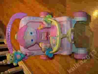 Wózek wyposażony jest w mnóstwo wspaniałych elemetów uatrakcyjniających zabawę: grzechotki, książeczkę oraz pozytywkę, którą uruchamia się naciskając na brzuszek misia! Zestaw zawiera również laleczkę