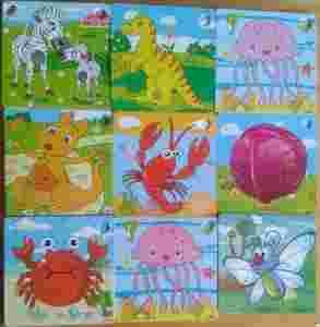9 układanek puzzle drewniane, klocki 81el.