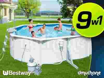 Basen stelażowy o wymiarach 488 x 366 x 122 cm kształtem przypomina wydłużony, nieco owalny ośmiokąt. W zestawie znajduje się profesjonalna pompa piaskowa do oczyszczania wody zdolna przefiltrować 3785 litrów/godz. z niezbędnym piaskiem. Basen ogrodowy posiada również wbudowany skimer – powierzchniowy oczyszczacz wody, w którego koszyczku zbierają się zanieczyszczenia pływające po tafli. To jednocześnie dozownik do chemii basenowej np. w postaci tabletek. W zestawie znajduje się także solidna dwustronna drabinka wykonana z metalu, bez której bezpieczne wejście do wody byłoby wręcz niemożliwe. Oprócz tego dodajemy zestaw czyszczący Deluxe, pływający termometr oraz 1kg Multitabletek.