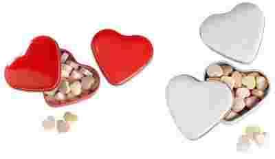 24 gr słodkich cukierków w kształcie serca, w metalowym pojemniku w kształcie serca.