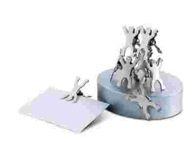 Owalna podstawka z metalicznymi klipsami - ludzikami, z których można złożyć rzeźbę.