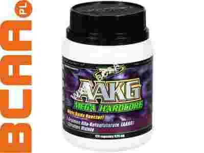 AAKG Mega Hardcore to preparat zawierający precyzyjnie dobraną kompozycję aminokwasu L-arginininy w jej najbardziej bioaktywnej i najlepiej przyswajalnej postaci - Alfa Ketoglutaranu Argininy (AAKG) - połączonej z jabłczanem cytruliny. Składniki te w organizmie człowieka są prekursorami wytwarzania hormonu gazowego - tlenku azotu, który to m.in. zwiększa dostarczanie składników: energetycznych (glukozy), budulcowych (aminokwasów) oraz tlenu wraz z krwią do komórek mięśniowych. Przyczynia się to do zwiększenia wydolności pracujących mięśni, co w czasie treningu objawia się znacznym przyrostem siły i wytrzymałości, a w okresie po treningowym do szybszej regeneracji organizmu. Ostatecznym efektem jest przyrost beztłuszczowej masy mięśniowej. Preparat zwiększa również sprawność seksualną mężczyzn, ponieważ tlenek azotu nasila m.in. procesy fizjologiczne warunkujące erekcję. Uwaga! W czasie treningu siłowego może nastąpić waskularyzacja mięśni, czego efektem jest poprawienie zarysu żylnego oraz zwiększenie obwodu pracujących mięśni.