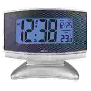 bardzo stylowy zegar Acctim, wskazuje oprócz godziny, temperaturę wenątrz pomieszczenia, kalendarz, alarm, napęd kwarcowy, zasilanie na baterie AAA 3 szt., obudowa plastikowa srebrna, podświetlenie na niebiesko, wymiary 6x10x12cm, waga 0,14 kg