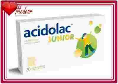 Acidolac® Junior, suplement diety, jest preparatem zawierającym dwa probiotyczne szczepy bakterii mlekowych Lactobacillus acidophilus i Bifidobacterium bifidum oraz prebiotyk - fruktooligosacharydy (FOS).