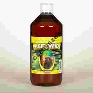 ACIDOMID H - GOŁĘBIE - 1L ZAPOBIEGA ZAKAŻENIOM BAKTERYJNYM ORAZ CHRONI PRZED KOKCYDIOZĄ. ACIDOMID jednak nie jest lekiem, nie zawiera też kokcydiostatyków i nie pozostawia dzięki temu resztek (residuów) w organizmie. Nie ma także terminu ochronnego. ACIDOMID zawiera komplet wszystkich kwasów organicznych ważnych w procesie trawienia i wchłaniania. Kwasy organiczne zakwaszają wodę przeznaczoną do pojenia, skutecznie ją także konserwują i stabilizują. W ten sposób wyraźnie ogranicza się mnożenie bakterii patogennych i pleśni w wodzie do pojenia, poidłach i w instalacjach z wodą do pojenia. Kwasy organiczne są lekkostrawne, w organizmie są dodatkowo wykorzystywane jako źródło energii. Kwasy organiczne redukują także dolegliwości przewodu trawiennego i poprawiają strawność białek. ACIDOMID dzięki substancjom o charakterze naturalnym ograniczają mnożenie się pasożytów wewnątrzkomórkowych, na przykład kokcydii. W celu uzyskania maksymalnego efektu należy jednak regularnie dodawać do wody do pojenia, kiedykolwiek ją zmieniamy. ACIDOMID jako jedyny preparat w swoim rodzaju na rynku zawiera zrównoważony stosunek pierwiastków elektrolitycznych wspomagających skuteczność poszczególnych składników aktywnych wyrobu. Elektrolity przyspieszają i zwiększają przechodzenie substancji czynnych przez błonę komórkową do wnętrza komórki. Skład: Substancje mineralne, elektrolity kwas (mrówkowy, propionowy, mlekowy, octowy, cytrynowy, ...) witaminy substancje naturalne, ekstrakt z ziół uzdatniona woda pitna Instrukcja podawania preparatu: Podaje się w ilości 10 ml na 1 litr wody do pojenia przez cały rok. Przez pierwsze 2-3 dni na początku podawania preparatu zaleca się stosowanie połowy dawki (0,5% tzn. 5 ml na 1 litr wody do pojenia). Równolegle zaleca się podawać: OPTIMIN - wzmocnienie układu odpornościowego i zwiększenie użytkowości AMIVIT - Koncentrat witaminowy KARNIVIT - do poprawy kondycji fizycznej, reprodukcji i odchowania młodych. Acidomid H dostępny jest w pojemnościach 0,5L 1L 3L 5L