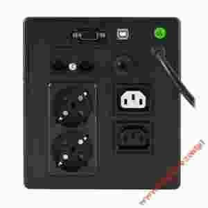 Zimny start. AVR. Zabezpiecza urządzenia elektroniczne przed zanikami napięcia, spadkami napięcia w sieci, a także ogranicza możliwość uszkodzeń w wyniku przepięć w sieci elektrycznej. UPS jest chłodzony za pomocą wentylatora. |