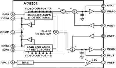 The AD8302 is a fully integrated RF IC for measuring amplitude and the phase between two independent input signals. The device can be used from low frequencies up to 2.7GHz. Integrates two closely matched wideband logarithmic amplifiers, a wideband linear multiplier / phase detector, precision 1.8V reference, and analog output scaling circuits. The applied input signal can range from -60dBm to 0dBm (ref 50ohm), which corresponds to a 60dB dynamic range. The AD8302 output provides an accurate amplitude measurement over +/-30dB range scaled to 30mV/dB and the phase measurement over a 0 to 180 degree range scaled to 10mV/degree. The device has been tested for use over the common Cellular bands (900MHz, 1.8GHz, 2.2GHz) and specified for operation out to 2.7GHz.