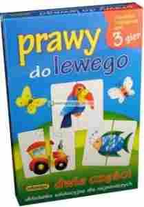 Opis produktu:Kiedy uczysz się zakładać buty, masz problem, czy ten but jwat na lewą, czy na prawą nogę? Kiedy bierzesz do ręki widelec i nóż, też się zastanawiasz, która to prawa, aktóra lewa ręka. Prawa, lewa, lewa, prawa...Trudna sprawa...Na podzielonych na dwie części kartonikach znajdują się rysunki różnych przedmiotów, ziwerząt i postaci. Po wylosowaniu kilku kartoników należy odgadnąć, jaki przedmiot jest na rysunku, jaka to jego część lewa, czy prawa, i dobrać jego stronę do lewej dołożyć prawą, a do prawej ...lewą. Na bazie układanki wewnątrz pudełka znajduje się opis 3 gier edukacyjnychGra przeznaczona:dla 1 do 6 osób w wieku powyżej 4 latZawartość pudełka:48 sztywnych plakietek o wymiarach 7,4 x 7,4 cm, podzielonych na dwie części oraz instrukcja gry