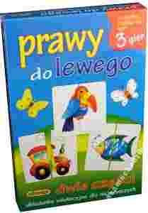 Opis: op. 27,5x18,5x3,5 cm Opis produktu: Kiedy uczysz się zakładać buty, masz problem, czy ten but jwat na lewą, czy na prawą nogę? Kiedy bierzesz do ręki widelec i nóż, też się zastanawiasz, która to prawa, aktóra lewa ręka. Prawa, lewa, lewa, prawa...Trudna sprawa... Na podzielonych na dwie części kartonikach znajdują się rysunki różnych przedmiotów, ziwerząt i postaci. Po wylosowaniu kilku kartoników należy odgadnąć, jaki przedmiot jest na rysunku, jaka to jego część lewa, czy prawa, i dobrać jego stronę do lewej dołożyć prawą, a do prawej ...lewą. Na bazie układanki wewnątrz pudełka znajduje się opis 3 gier edukacyjnych Gra przeznaczona: dla 1 do 6 osób w wieku powyżej 4 lat Zawartość pudełka: 48 sztywnych plakietek o wymiarach 7,4 x 7,4 cm, podzielonych na dwie części oraz instrukcja gry