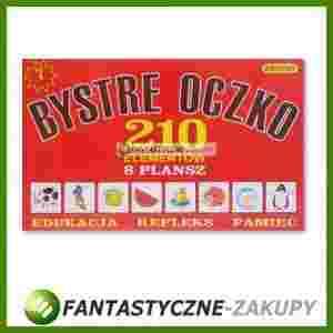 Mądra, atrakcyjna graficznie i starannie wykonana gra, która wyrabia spostrzegawczość, refleks, pamięć, ćwiczy analizę wzrokową i słuchową, naucza rozróżniac kolory i nazywać przedmioty. Bystre Oczko to propozycja 7 gier w postaci loteryjek obrazkowych, gdzie trzeba odszukać na planszy taki sam obrazek jaki widnieje na wylosowanej plakietce. Na drugiej stronie plakietki wyszczególniona jest nazwa i krótki opis przedmiotu. Zawartość pudełka: 210 twardych dwustronnie zadrukowanych plakietek (4,3x4,3cm), 4 duże sztywne dwustronne plansze (23,6x33,5cm), instrukcja. Gra przeznaczona: dla 2 do 20 graczy, w wieku od 4 lat.