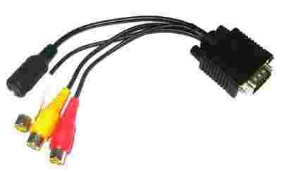• Końcówki w adapterze: 1x VGA (wyjście monitora, 15 pin męskie), 1x gniazdo S-VHS/S-Video (S-Video Mini Din 4 pin żeńskie), 3x RCA-gniazdo (żeńskie)