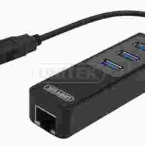 Y-3045 to zewnętrzna karta sieciowa 10/100/1000 Mbps Gigabit Ethernet, w połączeniu z 3-portowym koncentratorem USB3.0 marki Unitek. Urządzenie podłączane jest do komputera za pośrednictwem portu USB 3.0 (jednocześnie jest wstecznie kompatybilne z USB2.0). Zatem dzięki konstrukcji która składa się również na 3portowy HUB USB3.0 po podłączeniu tej karty do komputera użytkownik zyskuje dodatkowe trzy porty USB3.0