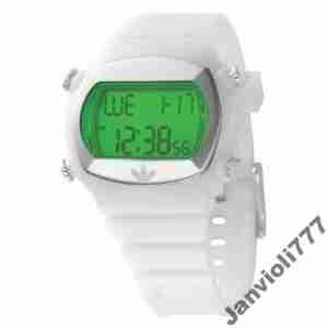 Brand Name: adidas Model number: ADH1934 Part Number: ADH1934 Case material: Polycarbonate Case diameter: 50 millimeters Case Thickness: 12 millimeters Band material: White Strap Band width: 20 millimeters Dial color: Green item-weight: 10.56 Ounces Movement: Quartz Water resistant depth: 50 Meters