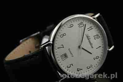 Klasyczna i bardzo czytelna ADRIATICA z datownikiem. Koperta jest w kolorze srebrnym, tarcza srebrzysta z czarnymi dobrze widocznymi cyframi. Zegarek jest na czarnym pasku z wysokiej jakościowo skóry. POLECAM jako bardzo elegancki i klasyczny zegarek. SWISS MADE!!!