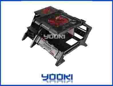 Otwarta konstrukcja z całą pewnością korzystnie wpływa na swobodny przepływ powietrza w obudowie, dzięki czemu użytkownik zaoszczędzi na kupnie dodatkowego chłodzenia. Mimo tego w zestawie znajdziemy jeden duży wolnoobrotowy wentylator na topie obudowy.