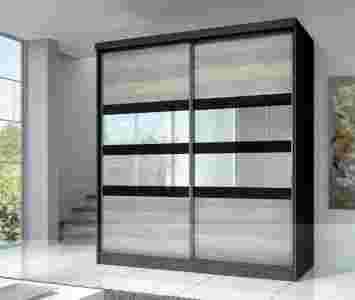 Duża, pakowna szafa z drzwiami przesuwnymi, wykonana z wysokiej jakości płyty laminowanej w trzech wybarwieniach korpusu do wyboru: biały, dąb cambridge lub dąb sonoma. Drzwi umieszczono na solidnych metalowe prowadnicach oraz rolkach na łożyskach renomowanej firmy SEVROLL, dzięki czemu drzwi lekko i płynnie, lekko się przesuwają. Fronty w kolorze wiąz lombardia + lustro + szkło czarne.