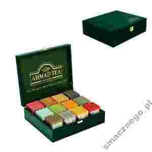 * Opakowanie: drewniane pudełko, 120 torebek herbaty w aluminiowych kopertach (12smaków po 10 torebek każdy).