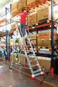 Akala DRABINA MAGAZYNOWA jezdna wysokość robocza 520 cm, szerokość 58 cm. Kąt nachylenia 60 stopni. Głębokość stopni 15 cm. Mozliwość złozenia.