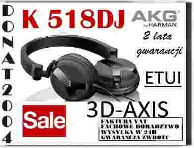 AKG K 518 DJ to zamknięte, dynamiczne słuchawki stereo ze unikalnym mechanizmem składania słuchawek 3D-AXIS umożliwiającym składanie ich w szybki i prosty sposób i "łamanie" ustawienia słuchawek do pałąka. Oferują one bardzo dobre odizolowanie od zewnętrznych odgłosów, wysoką efektywność i poziom głosu, a również ochronne etui.