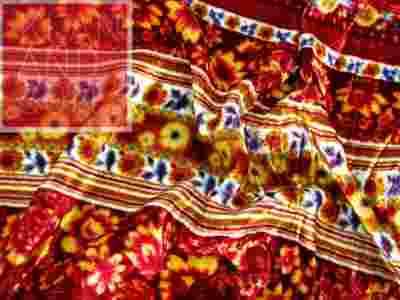 Miękki, lejący aksamit wiskozowy w poprzeczne ciemnoczerwone i rudawe pasy i kolorowe kwiaty.
