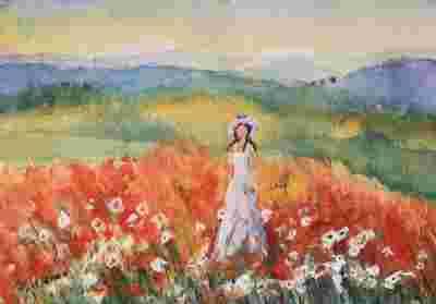 Namalowana na profesjonalnym, grubym papierze wysokiej jakości akwarelami.