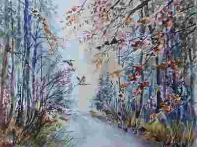 Akwarela Obraz Pejzaż W lesie duży