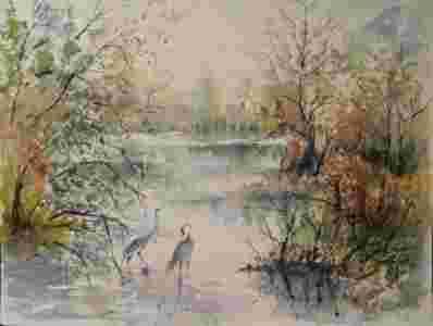 Akwarela Obraz Pejzaż z czaplami