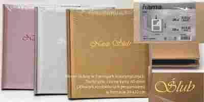 Albumy ślubne, tradycyjna na podklejki. Okładka usztywniona w kolorze złotym i srebrnym, kolor złota i srebra stonowany, matowy poprzez drobną fakturę. Napis "Nasz Ślub wytłoczony w kolorze okładki.