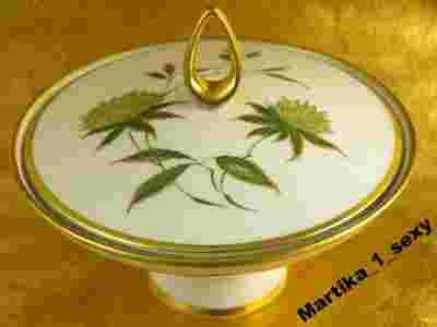 Bombonierka wykonana została z doskonałej jakości porcelany w kolorze delikatnego ecru,brzusiec ozdobiono trzema rzucikami w postaci listków,na przykrywie wkomponowano większą kompozycję kwiatową .Dekoracja przedstawiona w cudownym zestawieniu barw:zieleni i złota.Całość podkreślono ślicznie wymodelowaną sterczyną pokrytą złotem.Uwagę zwraca niezwykła,ponadczasowa i elegancka forma.