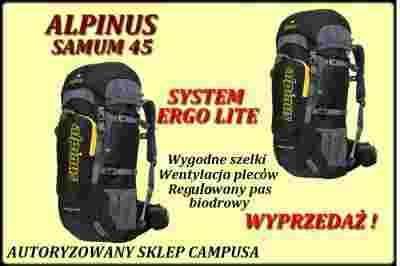 Plecak SAMUM 45 firmy Alpinus. Produkt objęty dożywotnią gwarancją. Doskonały plecak turystyczny. Niewielka waga plecaka, a jednoczesnie zastosowanie systemu ERGO LITE sprawia, że jest on wygodny nawet podczas dłuższego użytkowania.