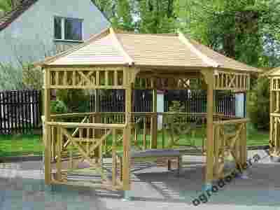 Drewniana 8-kątna altana poszerzana ECO o rozmiarach 3,5 x 2,6m to produkt klasyczny i gustowny. Do konstrukcji, składającej się z dachu złożonego z 8 gotowych płyt, złączonych technologią pióro-wpust o, przekroju 12 x 8mm oraz słupów o przekroju 7 x 7cm, dołożyliśmy Państwu w komplecie ażurowe ściany i kratownice.